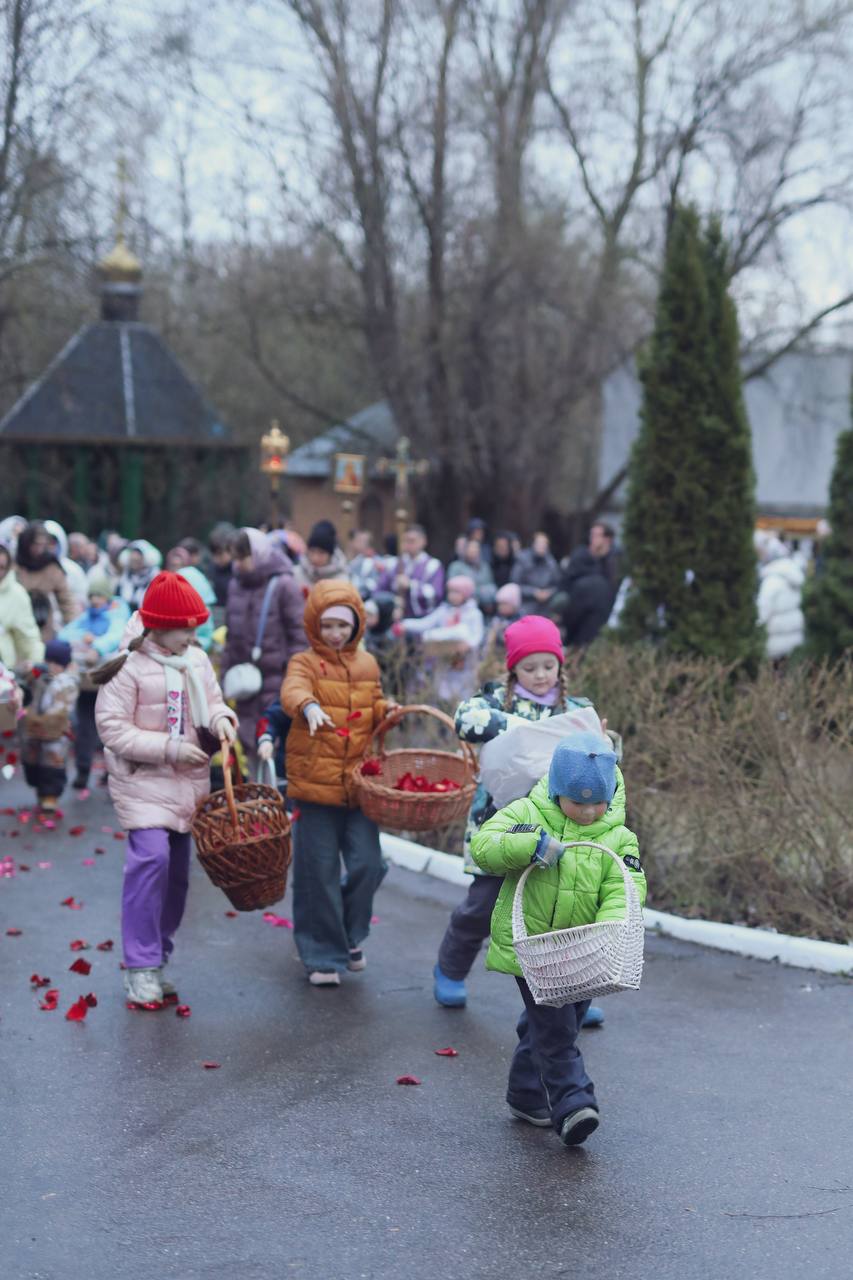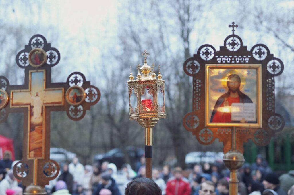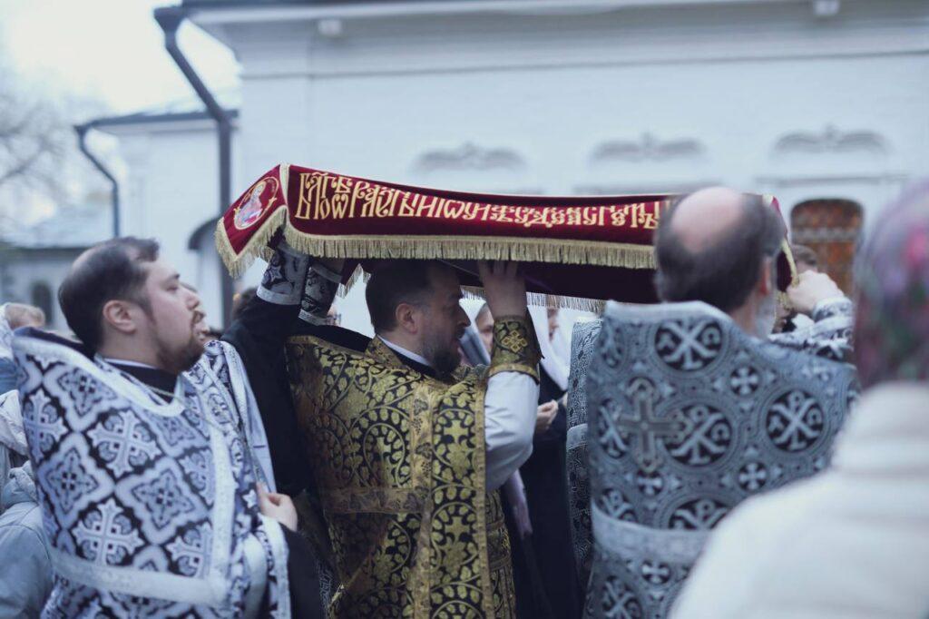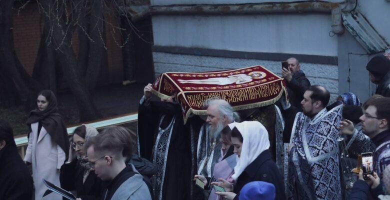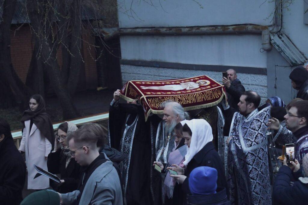 Завершая чин погребения, духовенство и прихожане под молитвенное пение «Святый Боже, Святый Крепкий, Святый Бессмертный, помилуй нас» крестным ходом обнесли Плащаницу с изображением положенного во гроб Спасителя вокруг храма.